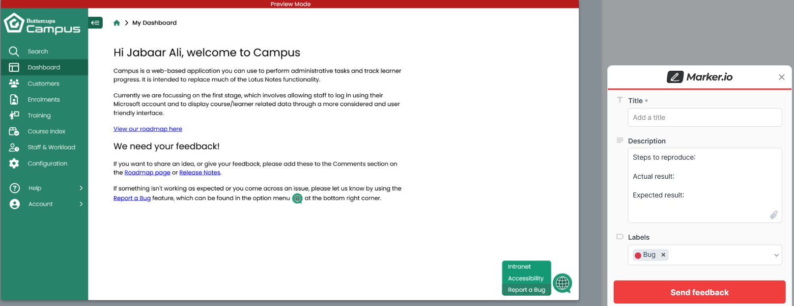 - Find and click on the Options icon (Green globe found bottom right hand corner) and then click on the Report a Bug link
